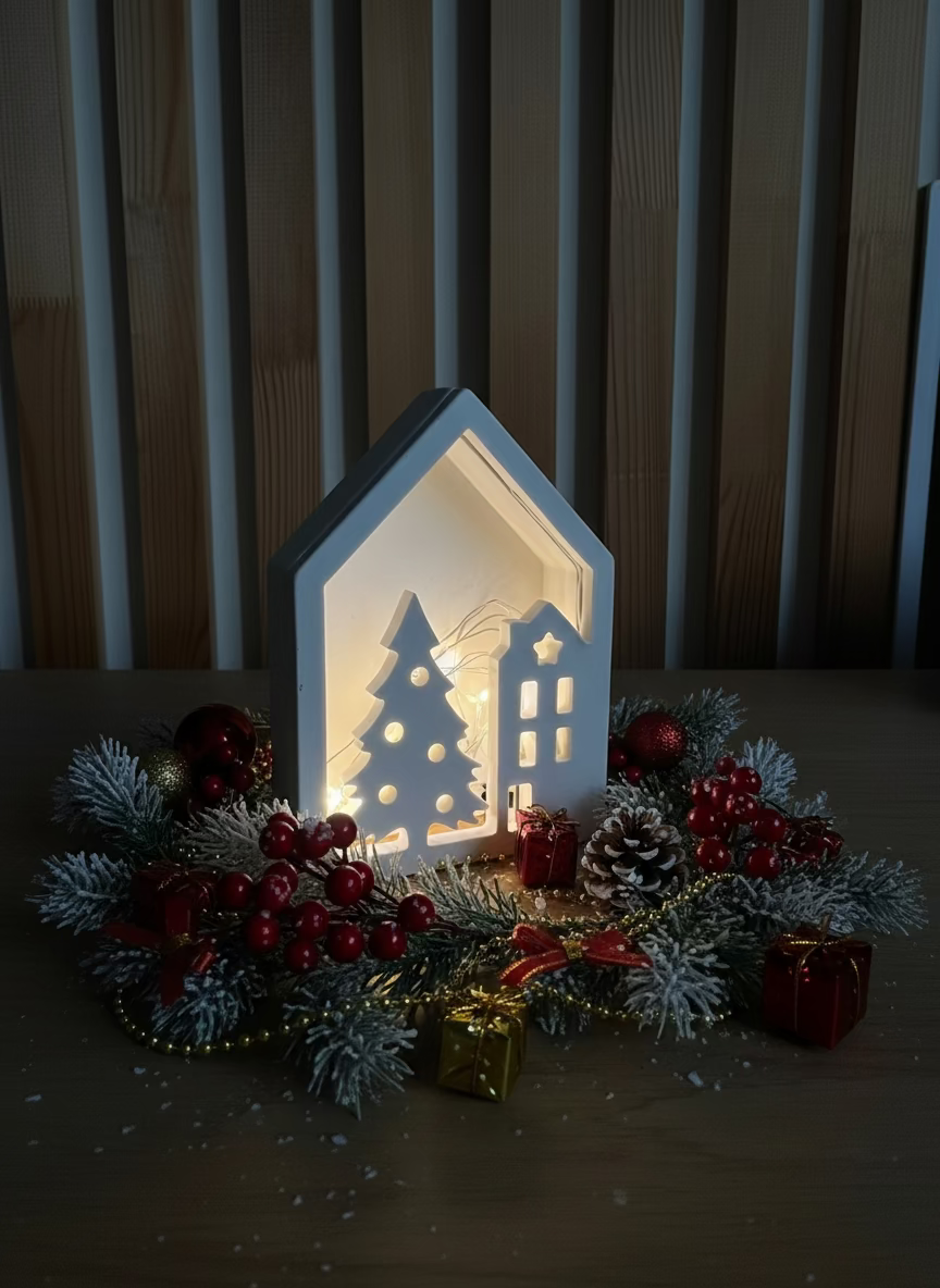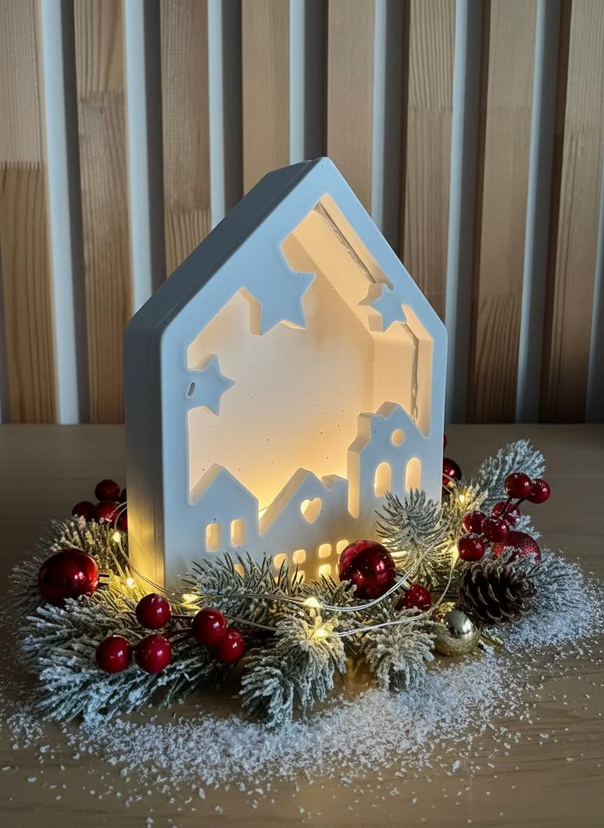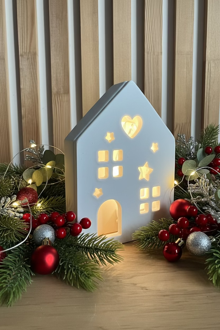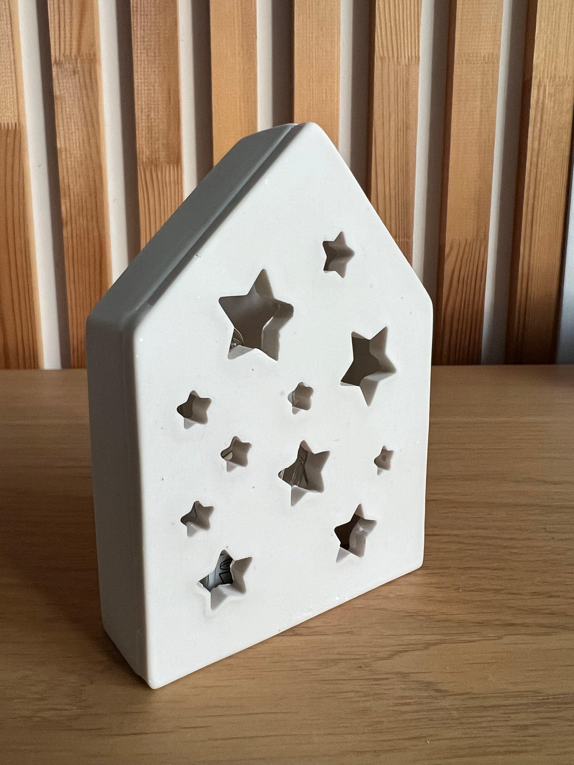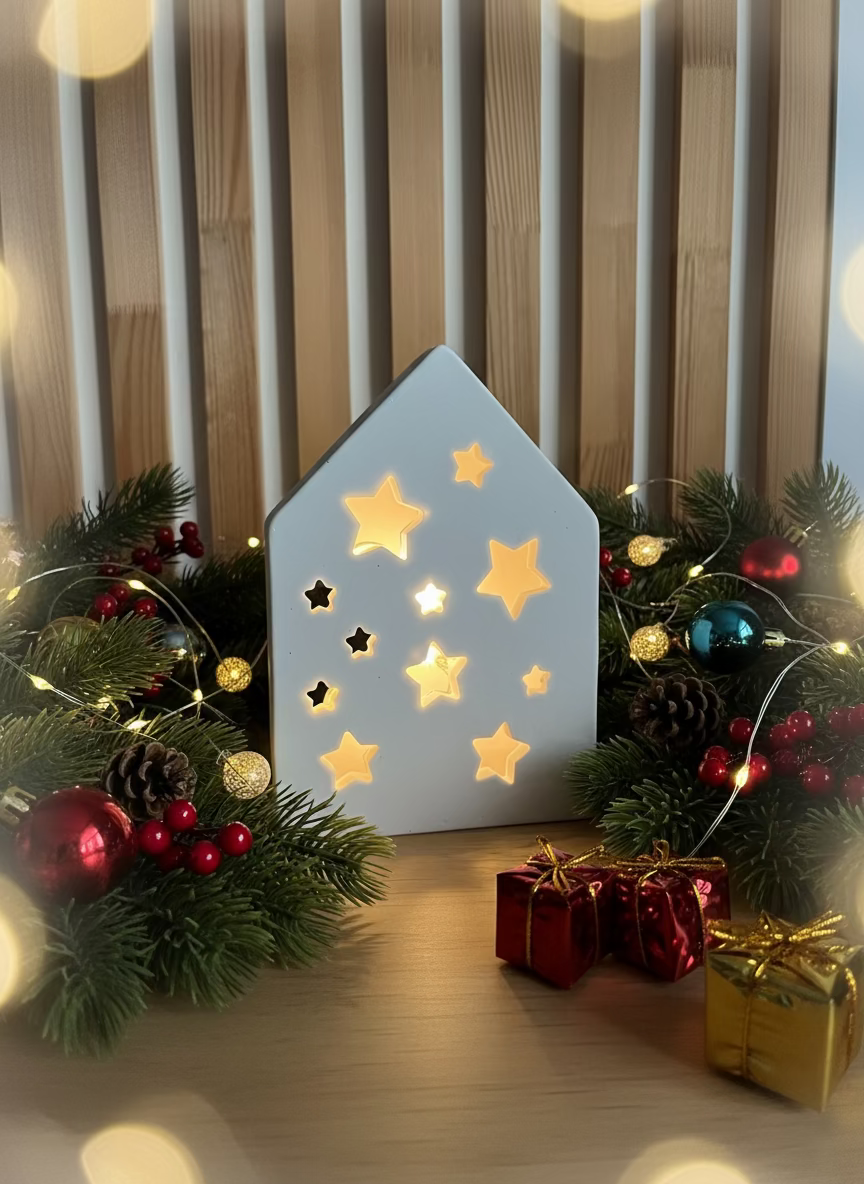 Cette petite maison poétique est entièrement réalisée en jesmonite, une matière douce et minérale au toucher velouté. Ses découpes en forme d’étoiles, de fenêtres et de cœur laissent délicatement passer la lumière d’une guirlande LED intégrée, créant une ambiance chaleureuse et réconfortante.