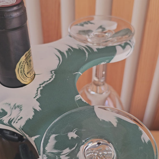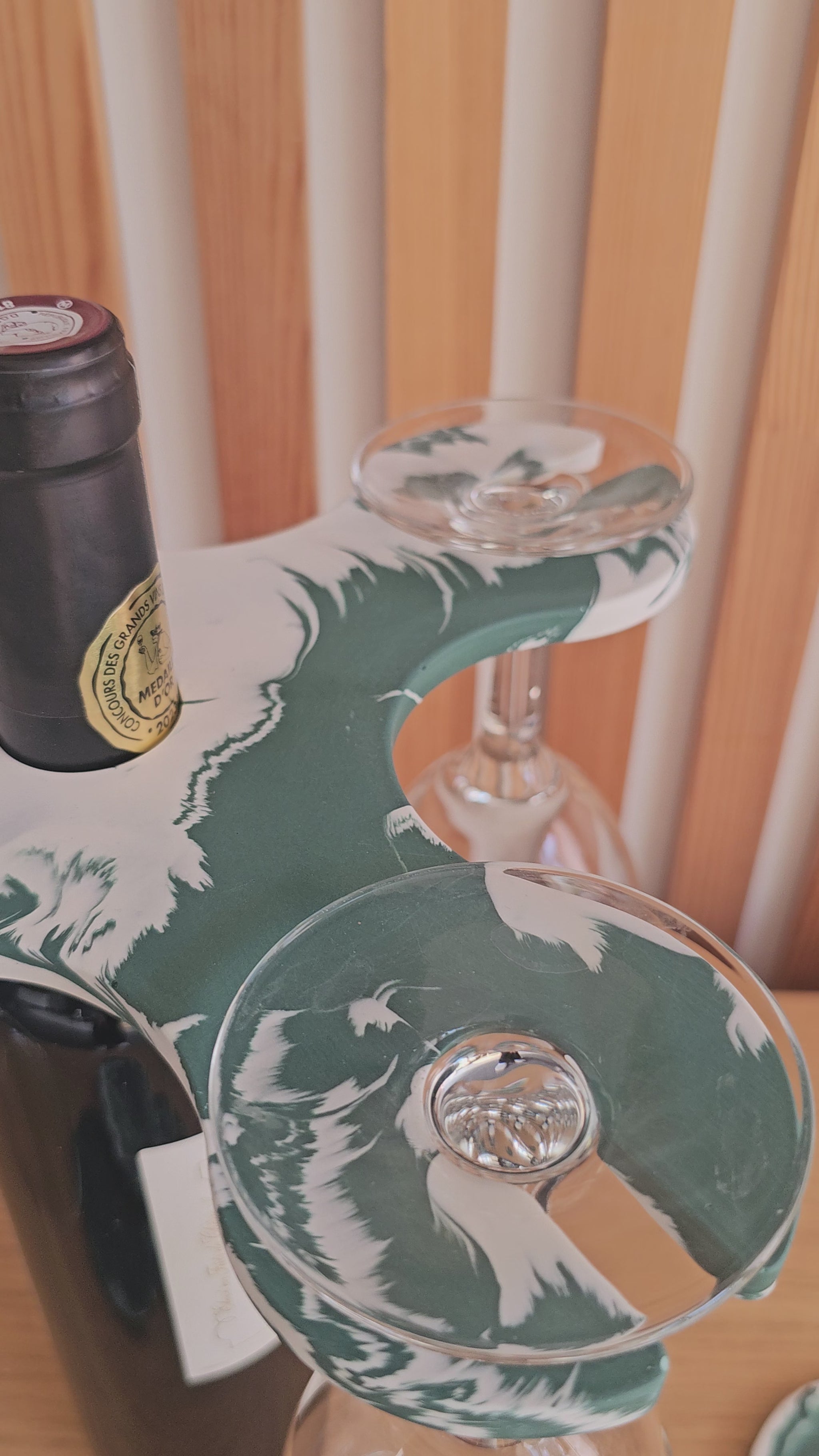 Élégance, utilité et créativité s’unissent dans ce porte-bouteille accompagné de ses quatre sous-verres assortis, entièrement réalisés à la main en jesmonite, une matière écoresponsable à base de pierre minérale.